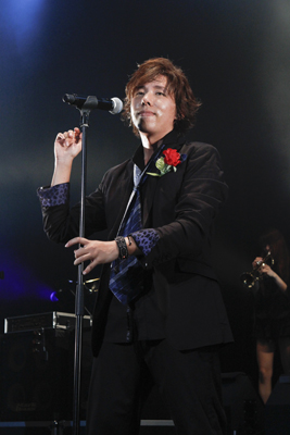 ふたりがステージから姿を消すと、バンドメンバーによるセッションがスタート。ギターの西岡和哉さんがステージの中央でクラップを始めると、会場もクラップで応える。やがてブラスの華やかな音も加わり、会場は音の波で溢れた。セッション終了とともにステージが暗転。スポットライトを浴びて登場したのは、煌びやかな仮面をつけた日野さん。「現代にもしオペラ座の怪人が蘇ったら」ということを想像して詩を書き上げたという新曲の『月夜の仮面舞踏会~Masquerade』を、バイオリンの美しい旋律に乗せて妖しく力強く歌い上げる。続いて披露する曲は、「オトナの秘密の恋をテーマにした」という『二つの雫-namida-』。伸びやかで綺麗な高温音の歌声が、会場全体を優しく包み込んでいく。