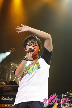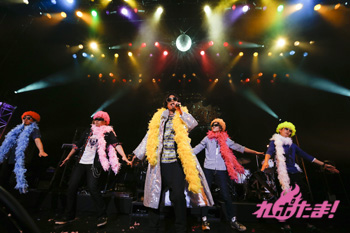 続く浪川は黒いジャケットに着替えて登場し、マイクスタンドを黒からオレンジへと染め上げる。「Dive in Love」から続けて披露されたのは「ファンキー☆トゥナイト」。スパンコールが目に眩しいロングコートに黄色のファー、そして金縁のサングラスと手にはシャンパン(に模したドリンク)を持ってステージに登場し、アフロのカツラを被ったバックバンドとダンスを披露。続く「MIGRATION」ではタオルを振り回し、ファンキーからムーディー、さらにパワフルと、全く違った顔でフロアを魅了する。