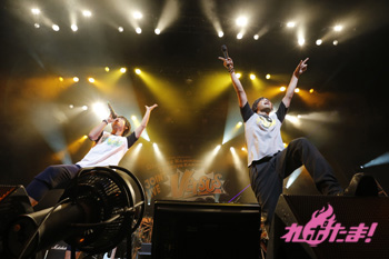 ステージ前に掛けられた紗幕に、浪川が黒、柿原が白い旗を手に向かい合うムービーが映し出されると、会場には二人のイメージカラーである黄色(浪川)と緑(柿原)のサイリウムが一斉に点灯し、二人の登場を待ちわびていた。