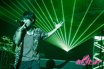 暗く抑えた照明の中、スポットではなくグリーンのレーザービームが柿原の周りをぐるりと囲むように照らし出して始まったのは、後半戦1曲目、柿原の「Chaos Breaker」だ。ステージに描き出された円が柿原を中心に回り出すと、会場からはどよめきが上がる。さらに柿原の指先に合わせフロアの上を横切るレーザーに、ファンからは歓声が上がった。「Bible of Heart」で縦ノリに、そして「Labyrinth」ではハットを被って登場と色んな顔を見せる柿原。