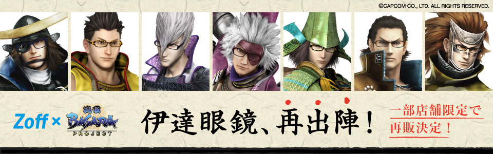 今回の「Zoff×戦国BASARA コラボ・ダテメガネ 第3 弾」は、伊達政宗に加え、徳川家康、石田三成、長曾我部元親、毛利元就の4 武将もついに参戦。前回好評だった片倉小十郎、猿飛佐助の待望の再販を加えた、全7 モデルで展開いたします。