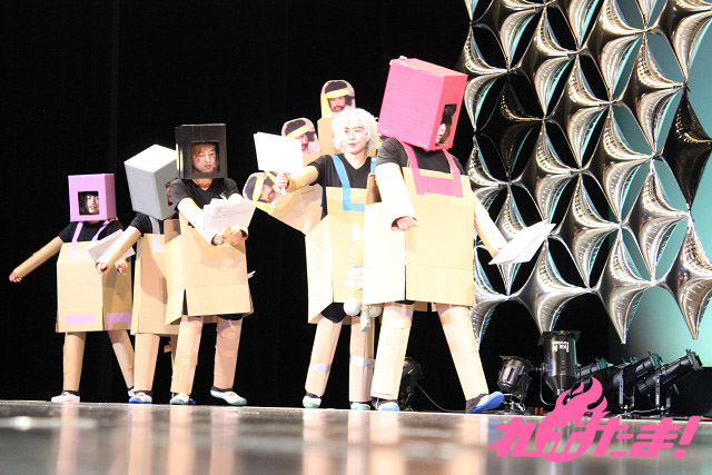 装甲が段ボールで出来ていることもあって舞台袖からステージ中央に出てくるまで大苦戦。思わず文句を言い始めるも、なぜかみなさん関西弁。森川さんが編み出した団扇台本を使っていますが、もうどこからがアドリブなのか分かりません。