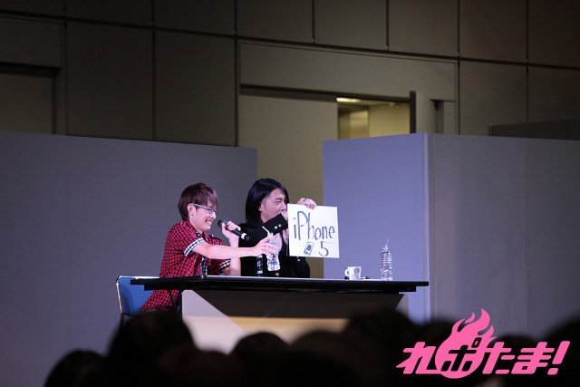 そして諏訪部さんは発売されたばかりの「i Phone5」。「通信ができないようなら殴りつけて魚を捕ったり火を起こしたりしたい」、という物理的な使用方法も提案(笑)。結果、諏訪部さんの圧倒的勝利!