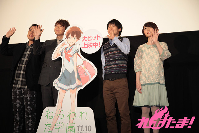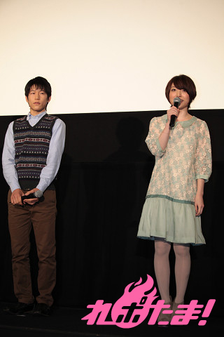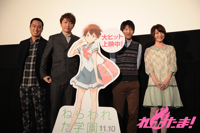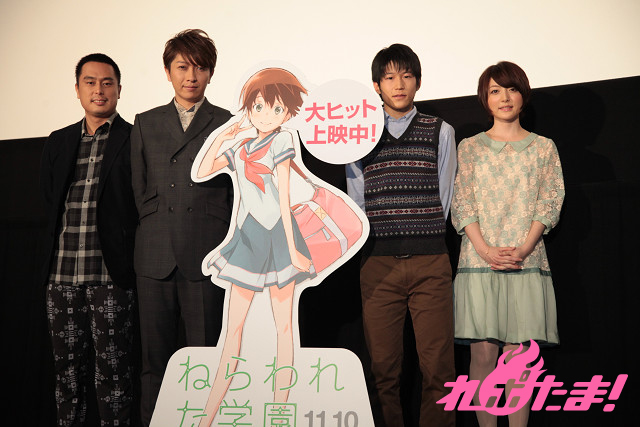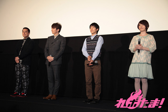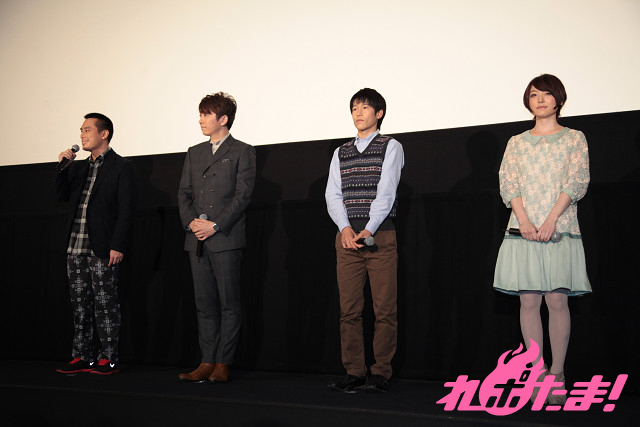 その舞台挨拶が2012年11月10日(土)、東京・テアトル新宿で行われた。上映前の観客を前に、関ケンジ役・本城雄太郎さん、京極役・小野大輔さん、カホリ役・花澤香菜さん、そいして中村監督が登壇。本作の見どころについて語った。