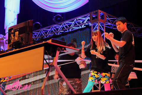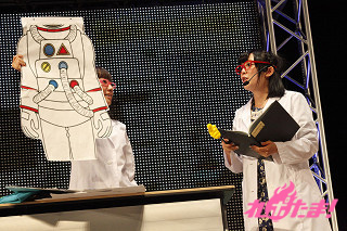休憩を挟んで行われたのは、杉田智和さんの『杉田智和のアニゲラ!ディドゥーーン!』と、岡本さん、マフィア梶田さんがパーソナリティの『RADIO 4Gamer』、そして小林ゆうさんの『小林ゆうの(仮)』のコラボ番組『ゲラ!Gamer!ゆうの(仮)』。まずは、小林ゆうさんが神輿に乗って登場し、場内は騒然(笑)。体感型ゲームシステム「Kinect(キネクト)」を使用したボクシング対決などで盛り上がり、勝者の杉田さんに、ゲストのイラストレーター・岸田メル先生から似顔絵を描いた色紙が贈られた。