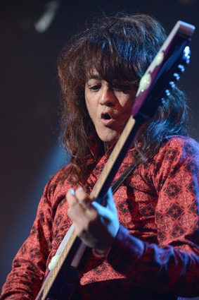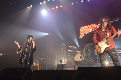 赤のシャツとデニムというカジュアルな衣装の福山だが、ギターは熱気バサラ・バージョン。キーボードがレイ・ラブロックと同じくショルキー(ショルダーキーボード)であることも、ファンを嬉しくさせる。