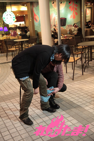 ふたりの前に用意されたのは、ロープ状の1本の太い布。運動会の種目でおなじみの「二人三脚」の要領でセンター内のスポットを巡り、『イナダンツリー』を目指してもらうことに。ふたりの友情を確かめ合ってもらう、素晴らしい企画がスタート!