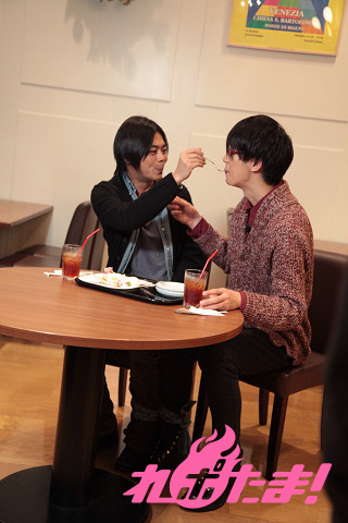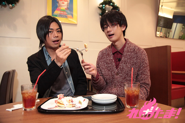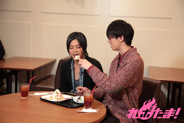 そして歩きつかれたふたりはカフェで一休み。パンケーキを食しつつ、劇場版『イナズマイレブンGO vs ダンボール戦機W』についてアツく語るふたり。ムードも高まり(?)仲良くお互いの口にパンケーキを運ぶ一幕も。