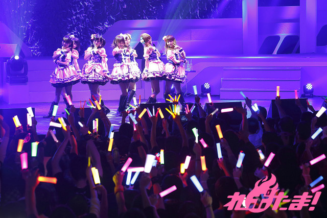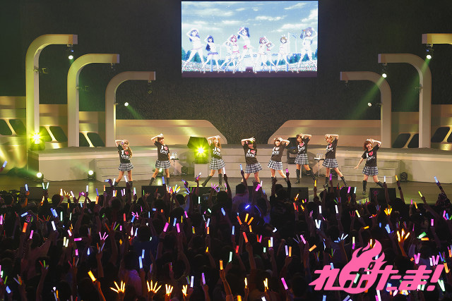色とりどりのサイリウムが振られる中、1stシングルから「僕らのLIVE 君とのLIFE」、そしてカップリングの「友情ノーチェンジ」を披露すると、放送が直前に迫ったTVアニメの見どころを語っていく。
