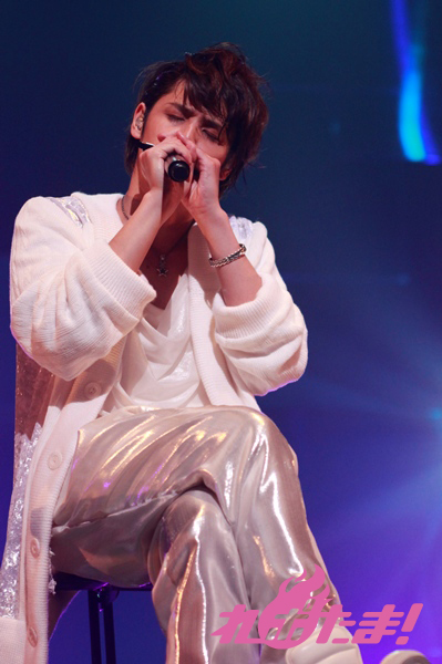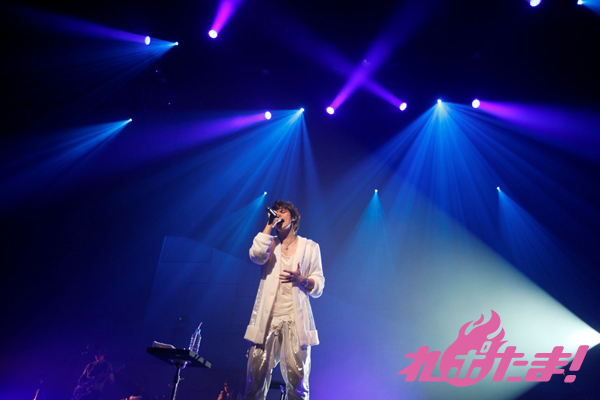メンバー紹介に続いては、雰囲気をガラリとかえた白い衣装で登場し、バラード曲「Beautiful Life」を歌いあげた。そしてここからはアコースティックコーナーへ突入。2010年のライブツアー“WONDERING!”以来となる「逆さま地球 –acoustic-」やブルースハープを吹く姿を披露した「A Happy New Year to you」(元曲は「Xmas to you」)に加え、4月10日にリリースが決定しているニューシングル「カノン」のカップリング曲「FOREVER LULLABY」を次々に歌いあげ、その甘い声で会場のファンを魅了した。