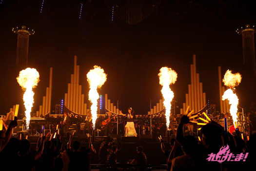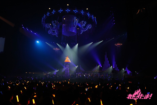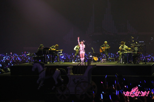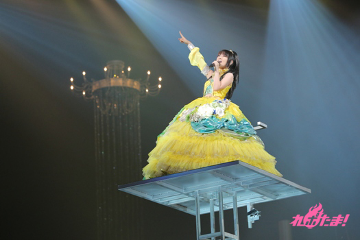 メルヘンな演出が終わった後は、中央のシャンデリアから奈々ちゃんが登場。「残光のガイア」を歌い上げ、ファンの熱気もいきなりマックスに! さらに「SCARLET KNIGHT」で真っ赤に染め上がる場内。