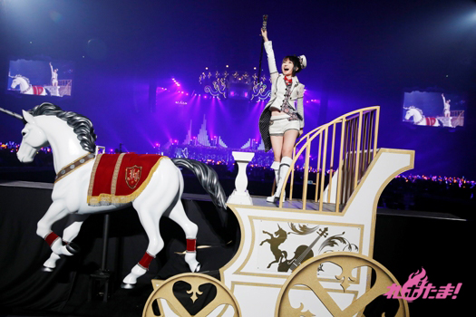 さらにここから77人のコーラス隊「グレーススペシャルコーラス」が登場。そして、2010年に行われたライブツアー『LIVE ACADEMY』で跨った愛馬が「お奈々キャップ-GRACE FORM-」として復活! 会場内を移動しながら新曲「アヴァロンの王冠」を熱唱した。
