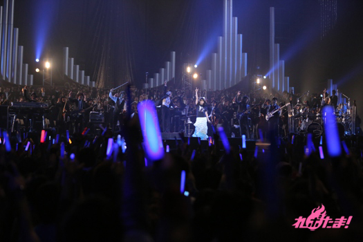 再びメインステージに戻り「TRANSMIGRATION」を披露すると、奈々ちゃんは一時退場。オーケストラ部隊がホルストの『惑星』より「ジュピター」で圧巻の演奏を披露した後はチェリーボーイズが再び合流。ギター・「ケニー」こと北島健二さん、ドラムス・「ゆたぽん」こと渡辺豊さんも加わり、さらにアツいステージが展開。「BRAVE PHOENIX」「Pray」、そして12年末に行われた『第63回 NHK紅白歌合戦』でも披露された「BRIGHT STREAM」とたたみかけた。