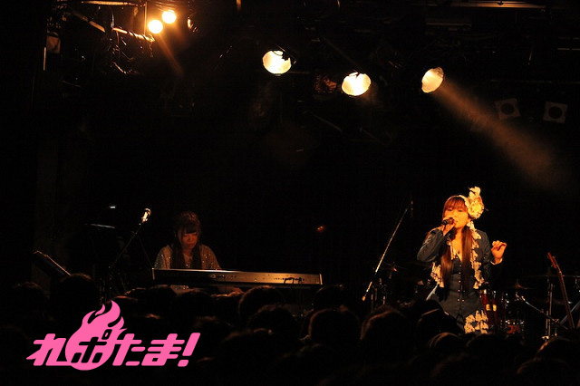 続いて、照明が青色に変わり、「これから海に出ます。いい出会いがあるかもしれませんよ!?」と「The Azure -Latin Acoustic ver.-」をしっとりと歌い上げ、ファンからの恒例の「回って!」リクエストに応え、一緒に回った、キーボードのたまちゃんと「遠雷-Piano Ballad ver.-」を披露した。