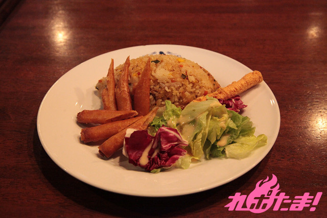 和食好きな焔をイメージした和風五目チャーハンに、焔の6本の日本刀をイメージした明太チーズスティックと、背中の緋色の太刀をイメージした、チーズの唐揚げを添えて。