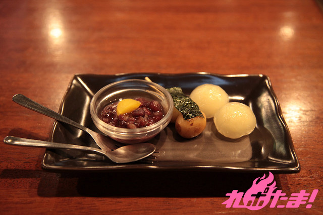 懐石料理が好きな斑鳩をイメージして、向付に2つの「乳」をイメージした、柚子味の水まんじゅう、焼き物に磯辺の串団子、汁物に栗小豆ぜんざいを持った一汁二菜の甘味懐石。