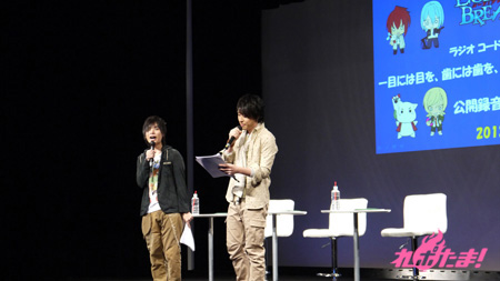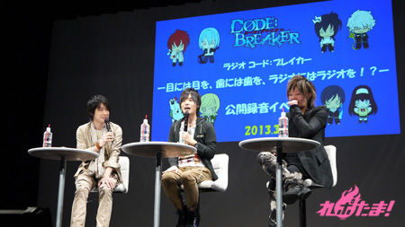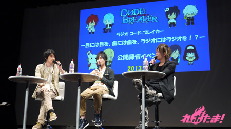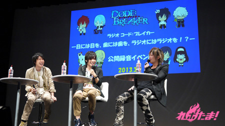 好評のうちに放送が終了したアニメ『コード:ブレイカー』のWEBラジオ『ラジオ コード:ブレイカー 目には目を、歯には歯を、ラジオにはラジオを!?』(通称・にはラジ)の公開録音が2013年3月9日(土)、東京・科学技術館大ホールで行われた。