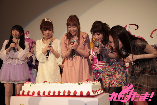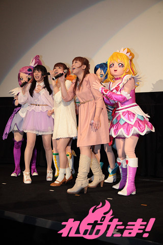 その初日舞台挨拶が行われ、東京・新宿バルト9には『ドキドキ!プリキュア』からキュアハート役の生天目仁美さん、キュアロゼッタ役の渕上舞さん、キュアソード役の宮本佳那子さん、『スマイルプリキュア!』からキュアハッピー役の福圓美里さん、キュアサニー役の田野アサミさん、キュアピース役の金元寿子さん、キュアマーチ役の井上麻里奈さん、キュアビューティ役の西村ちなみさんが登壇。