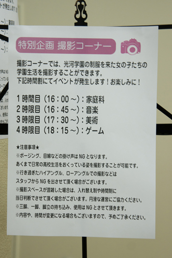こちらは時間割で区切られ、家庭科では裁縫の様子を、音楽ではオカリナとキーボードの演奏の様子を、美術では粘度細工とお絵かきの様子を、ゲームではPSPをプレイしてる様子を来場したお客さんが自由に撮影することができるコーナーで、多くの人が撮影を楽しんでいた。