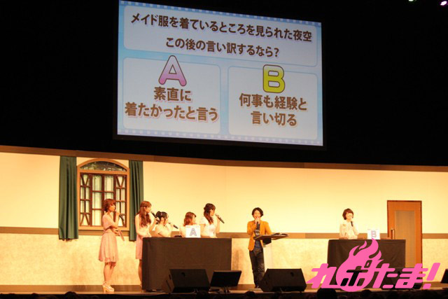 まずは第6話で夜空がメイド服に着替えたシーンにちなんで、メイド服に着替えているところを見られたら、何と言い訳するか、という問題。選択肢は「A:率直に着たかったと言う」と「B:何事も経験だと言い張る」だったが、ここでは花澤さん以外がみんなBを選択。