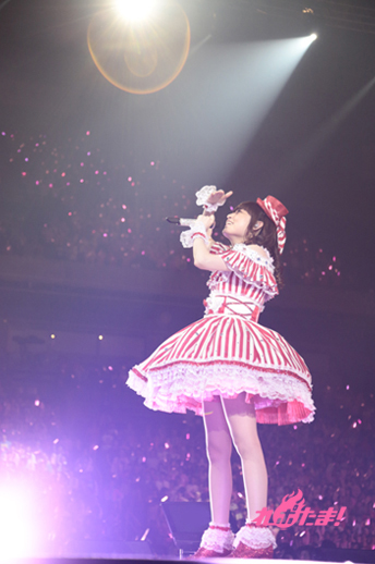 鳴りやまない拍手と歓声をうけて、ゆかりんはトロッコで3度目となる会場巡りしながら感謝の御挨拶。一人ひとりファンの顔を見つめながら、手を振り続けると再びステージに立って「ありがとうございました。こんな大きな会場に立たせてくれてありがとう。いつもすぐふざけちゃって、なかなか思ってることが言えないんだけど、ホントにみんなが連れてきてくれた場所なので、とても嬉しく思っています」と瞳を潤ませながら想いを込めて一言。