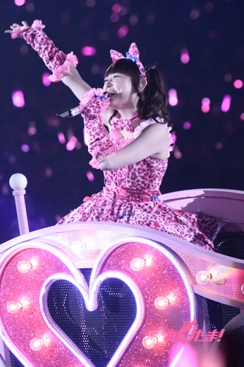 さらにピンクのドレスと、ネコミミを付けた可愛い姿になると、綺麗に飾り付けられたトロッコに乗り込むや、客席に手を振り歌いながら後方ステージ経由で会場を一巡り。