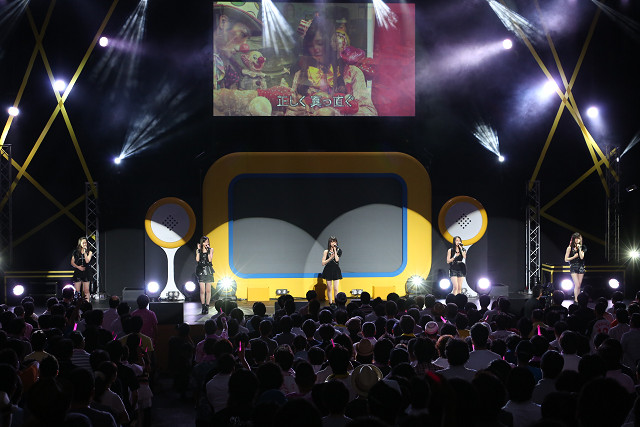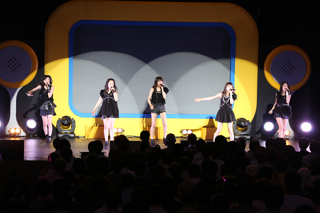 舞台上には巨大なTVが設置されていた。「5つの魔法」と題された物語は、舞台上へ2人のピエロ(一人は小林玄)が現れたところからスタート。大きなリモコンでスイッチを入れたとたんTV画面に映し出されたのは、楽屋でくつろぐ東京女子流のメンバーたちの姿。やがて彼女たちは、巨大なTV画面の中と外を行き来しながら、訪れた人たちに様々な魅力を伝え始めた。