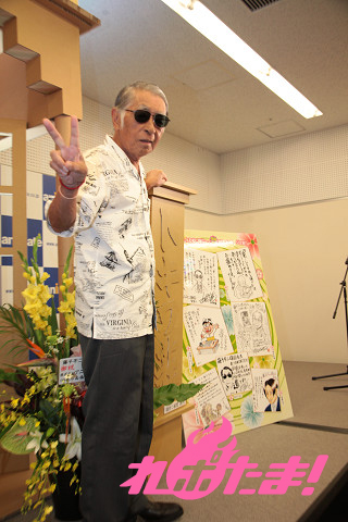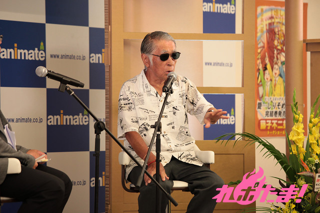 小学館のコミック営業一課、西堀靖氏とのトークショーに臨んだ先生。ファンとの記念撮影に臨んだ後は、時間を忘れるくらいトークが弾んだ。