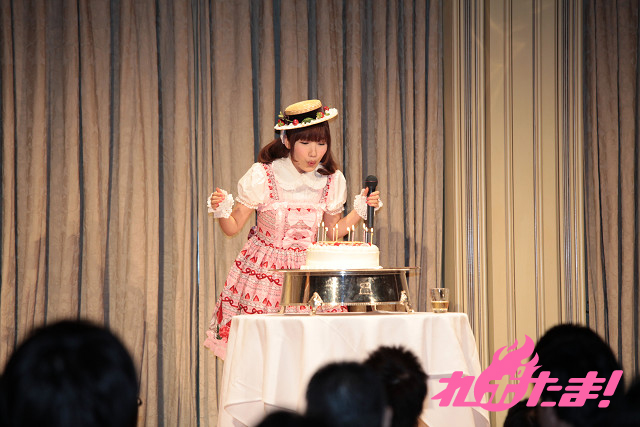 ステージに登場すると、さっそく各テーブルを乾杯して回った内田さん。ステージに戻ると大きなバースデーケーキが用意されており、笑顔で火を吹き消すと、会場から大きな拍手が沸き起こった(※ちなみにロウソクの数は10本でした!)。