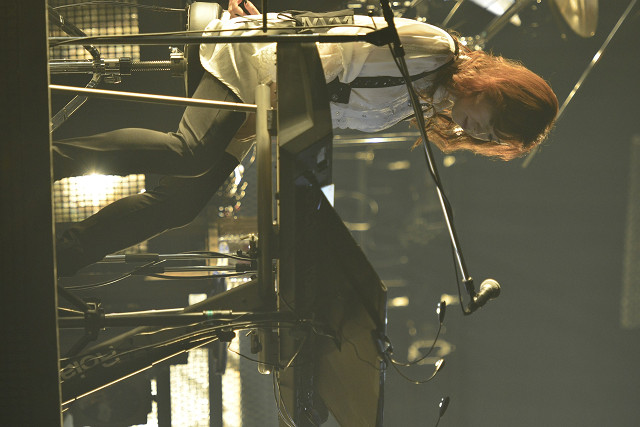 ライブ後半には、『デュラン召還』~『目覚め』(『舞-HiME』より)、『stone cold』(『セイクリッドセブン』より)で、1階席、2階席のファンが総立ち。掛け声とともに、拳を突き上げる。梶浦も、鍵盤から手を放し、会場を見渡しながら、右手、左手、両手、両手と突き上げる振りで、さらにファンを煽っていく。歌姫4人もステージいっぱいいっぱいまで出てきて、何度も拳を突き上げるポーズをするなど、ステージと会場が一体となって、盛り上がりも最高点に達した。