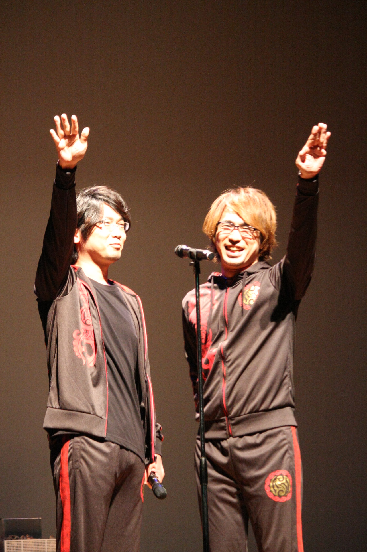 開演直後、ステージにそろって上下ジャージ姿現れた小西さんと安元さん。センターに設置されたスタンドマイクに立つと、すっと手を挙げ、声を合わせて「宣誓!」。「私、安元洋貴はすごい頑張ってる、という体でお届けすることを誓います」、「私、小西克幸はすごい台風が近づいているので、いつもより巻きでお届けすることを誓います(笑)」と一人ずつ宣誓した後、タイトルコールでスタート。