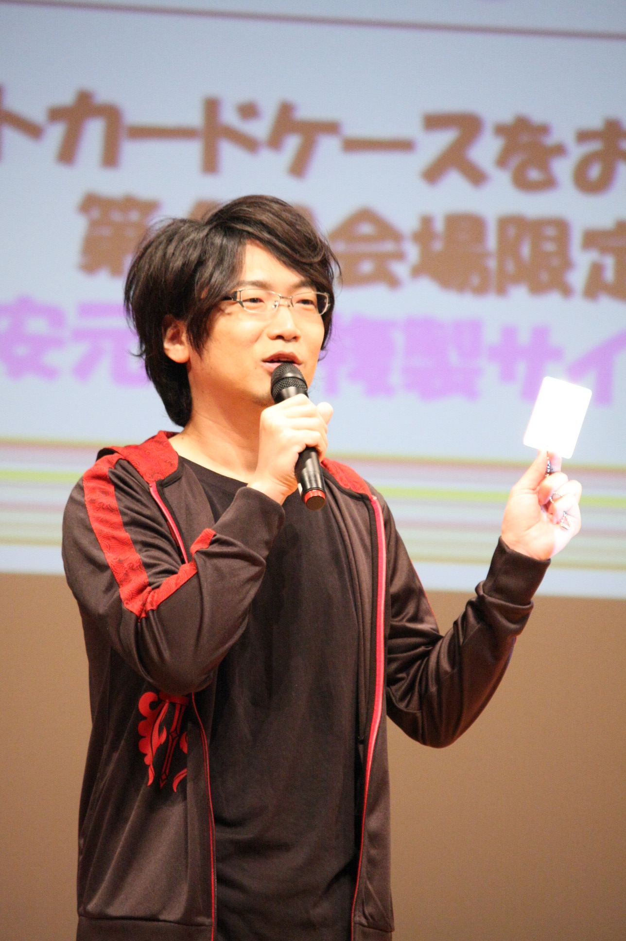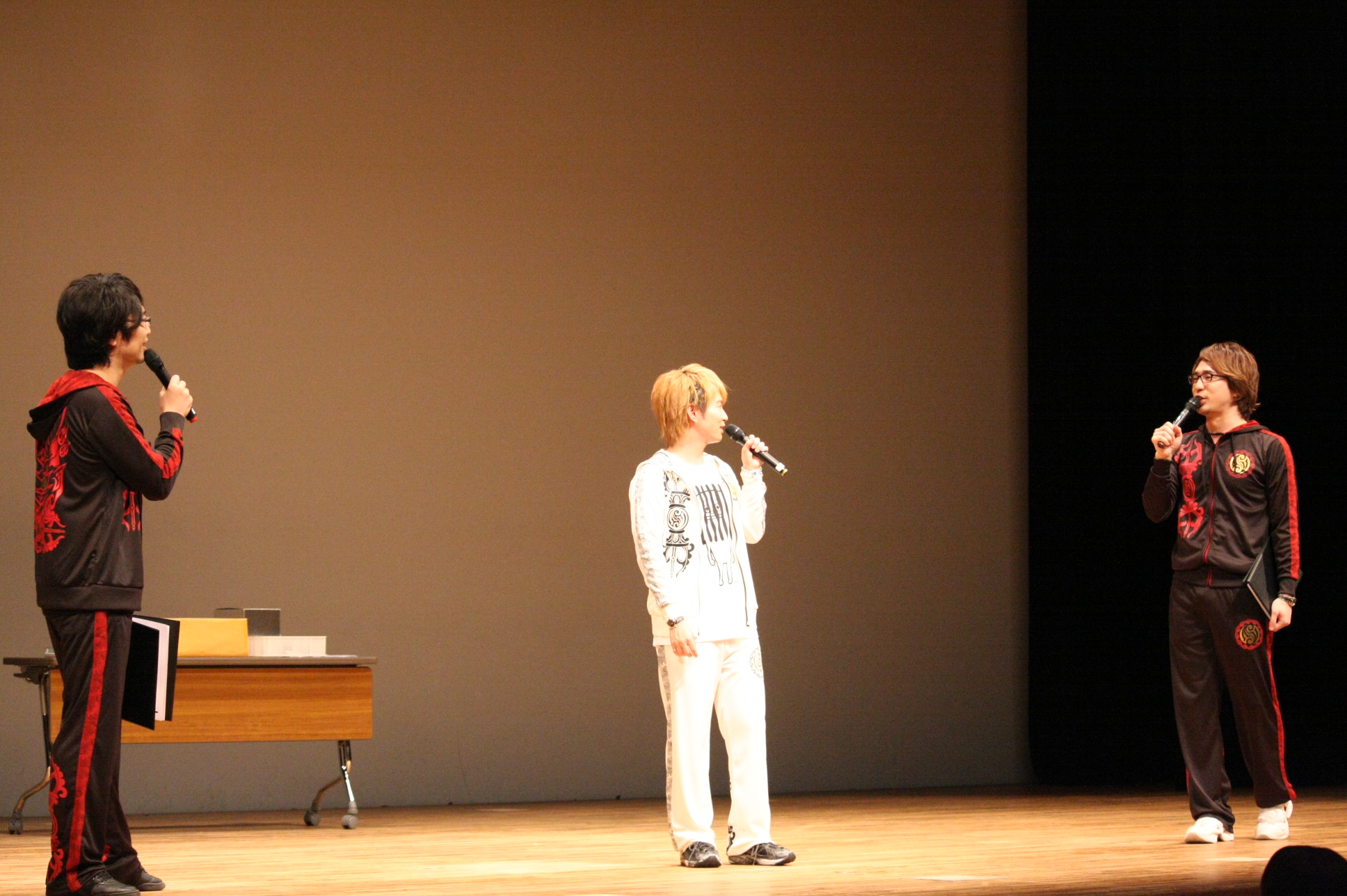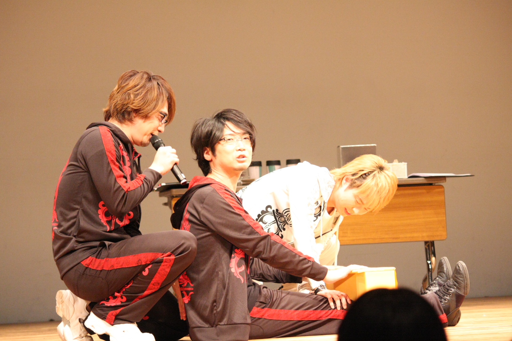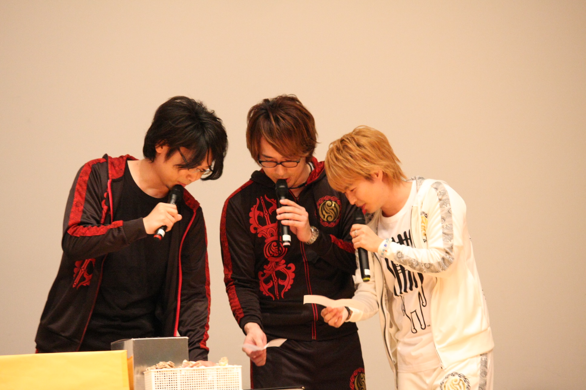 会場のアンケート紹介では、最初、代永さんがアンケートを読み、安元さんと小西さんが書いた人の席へ行ってインタビュー。小学校の騎馬戦で武田軍と上杉軍に分かれ、最後は総大将戦でかぶとを取り合うという話題、お弁当のおかずがいなご、運動会で撮影席の取り合いで親同士が乱闘になった話など、爆笑ネタの連続。途中で代永さんが会場レポーター役になると、通路を通るたびにお客さんから下半身に熱い視線を向けられて恥ずかしそう。しかし、終盤ではすがすがしい表情で会場を歩いていた(笑)。