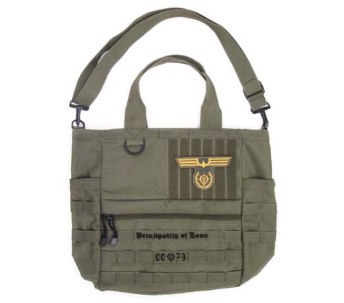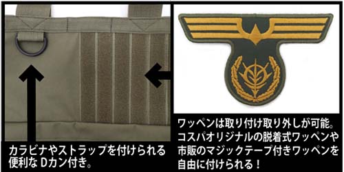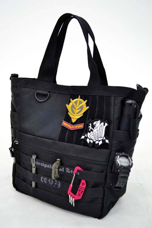 トートのサイドには折りたたみ傘を装着。マジックテープ部分には、ギレン総帥直属のエリート部隊「ジオン公国防衛部隊」のエンブレム脱着式ワッペンを装着。カジュアルの中にエリート感をちょっとアピール!