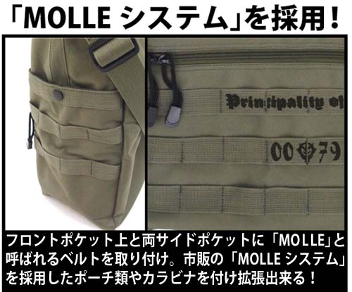 “MOLLEシステム”とは、アメリカ軍が採用している個人装備システムの名称(MOLLE は MOdular Lightweight Load-carrying Equipment の略語)で、兵士個人個人が必要な装備を効率よく、かつ手軽にカスタマイズして携行できるよう開発されたシステムです。