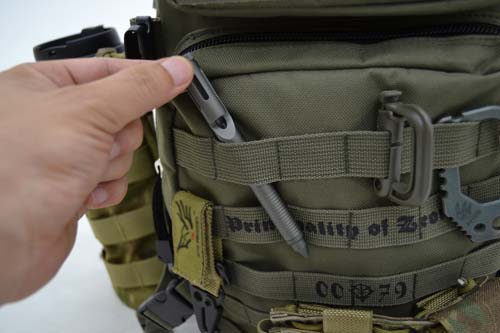 プライベートのちょっとしたお出かけや、普段使いをイメージして、正面部分のMOLLEにペンやカラビナ、ポーチを。