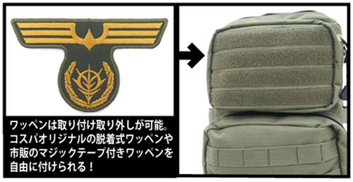 付属のワッペンは脱着可能で、コスパの脱着式ワッペンシリーズや、市販の脱着式ワッペンの取り付けが可能。背面と肩ベルトには