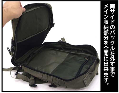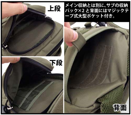 フルオープン出来るメインの収納パックと2つのサブパックに加え、各所には小物入れに最適なポケットが充実、ポーチ類やカラビナ、ツールなどを付ける事ができる機能的な拡張用ベルトを取り付け、便利で使いやすい仕様です。