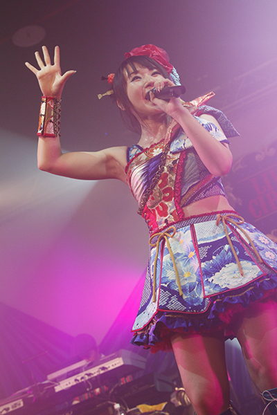 続いてはタオルでの振り付けが特徴的な「Happy☆Go-Round!」に続き、「DISCOTHEQUE」を披露し、会場がピンク色のペンライトに変わっていった。ライブ中盤の11曲目は、水樹のライブでは必ずといっていい程セットリストに入ってくる「POWER GATE」を披露。「oh〜oh、oh〜、POWER GATE〜!」という日本でも定番のファンとのやり取りがここ台湾でも行われていた。