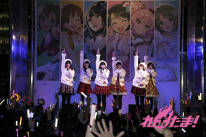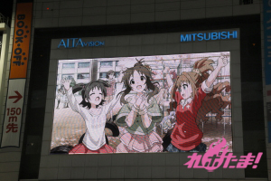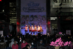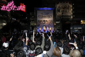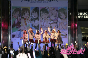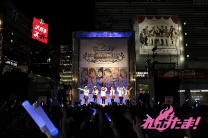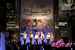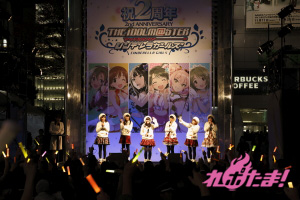 当日は、青木瑠璃子(多田李衣菜役)、大坪由佳(三村かな子役)、大橋彩香(島村卯月役)、原 紗友里(本田未央役)、福原綾香(渋谷 凛役)、佳村はるか(城ヶ崎美嘉役)が登壇。事前に配布された整理券をゲットした多くのプロデューサー(ファン)と、道行く人々の注目を集めて行われた。