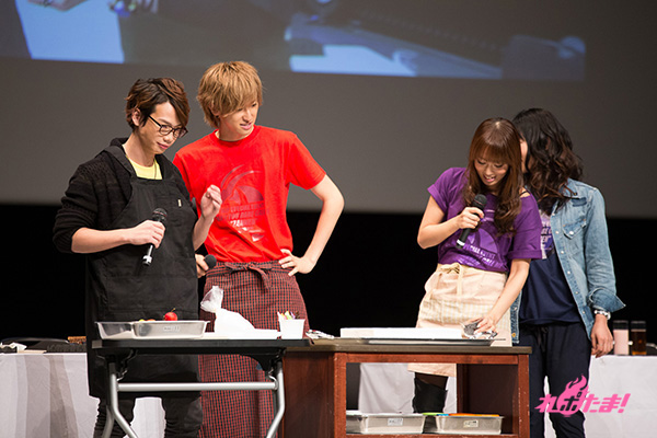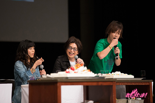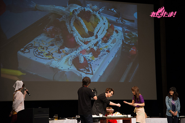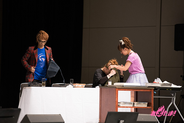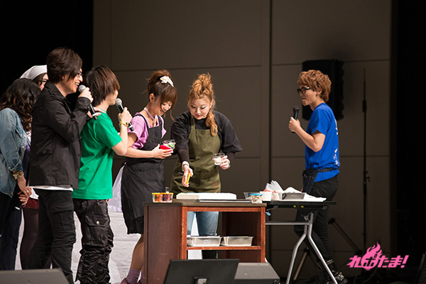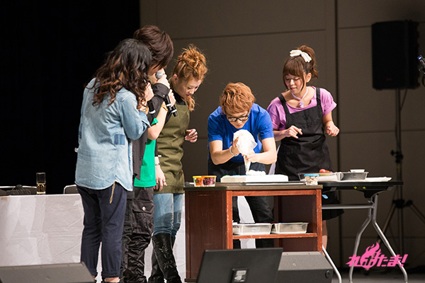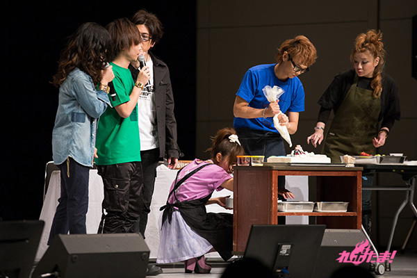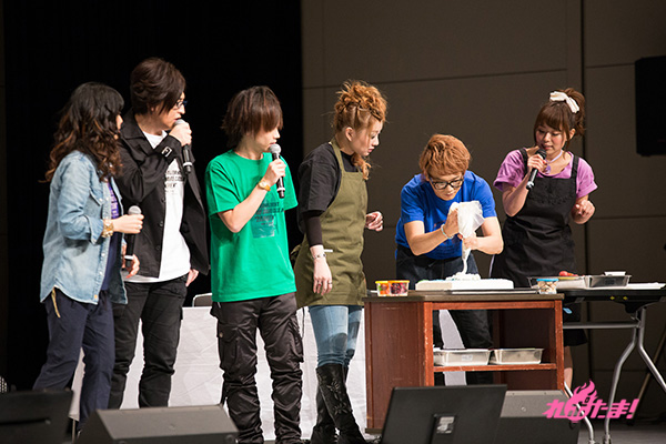 乾杯が終わった後は、webラジオ「GDF広報室提供『MJPザンネンラジオ』」でお馴染みのラビッツドルチェ対決へ。相葉さん、日笠さん、池田さんの“イズルチーム”と、浅沼さん、井口さん、渡辺さんの“アサギチーム”に分かれ、「宇宙」をテーマにしたケーキのデコレーションで、「味」「美しさ」「テーマに沿っているか」の3点で競い合うことに。審査員は沢城さん、緑川さん、鈴木さんが担当した。