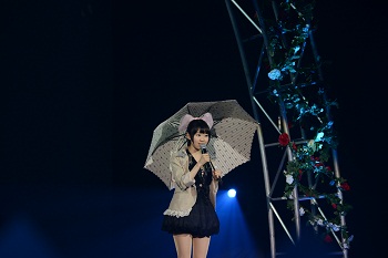 アニメ映像をバックに、3曲続けて歌った『神のみ』のエンディングテーマ。そしてお着替えタイムを経て、シックな黒い衣装になってからの後半は、1stアルバムからの楽曲も交えて、一層カラフルにショーアップされていく。「想いはRain Rain」の傘を使った演出、「君色ラブソング」でのステッキを使ったダンスなどで盛り上がった。何より真っ白なドレスを纏ってピアノ弾き語りで歌った「らぶこーる」は素晴らしく、会場は大きな感動に包まれた。