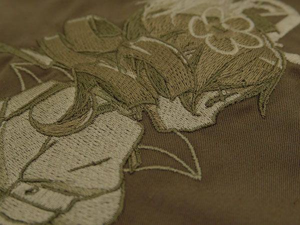 10万ステッチを超える圧倒的な刺繍密度で、糸色、振り方向までこだわった国内工場製。