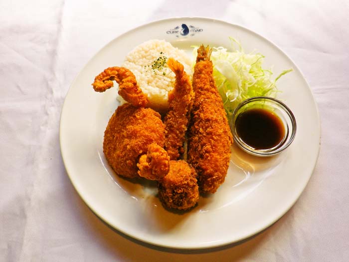 エビフライ、いわしフライ、触手が飛び出たコロッケ、しいたけフライと、満艦飾家のフライのなかでも食べやすいものを選んで盛ったプレート。見た目はアレだが(笑)、味は保証!!