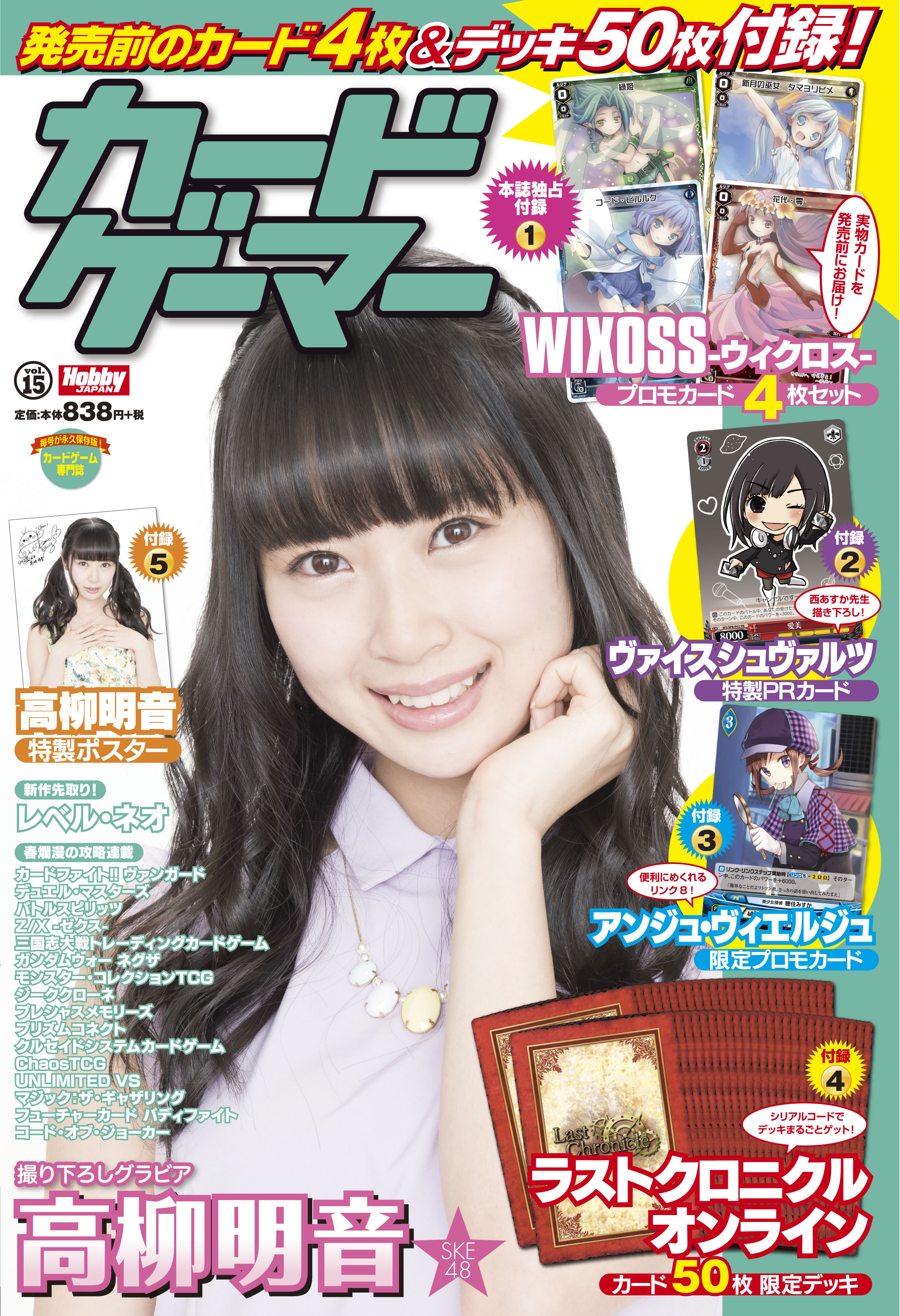 カードゲーム専門誌「カードゲーマーvol.15」は、期待の新作カードゲーム「WIXOSS –ウィクロス-」プロモカード4枚セットや「アンジュ・ヴィエルジュ」プロモカード、「ラストクロニクルオンライン」デッキ取得用オンラインコードなど、豪華付録でお届けします。表紙はSKE48 高柳明音さん! 今号も永久保存必至の内容です!
