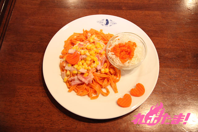 「乙女式恋愛塾」の衣装をイメージした、トマト味のタリアテッレにチーズクリームソースをかけて。