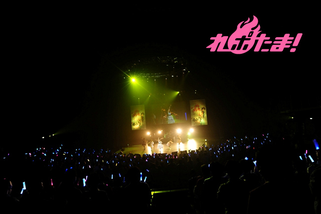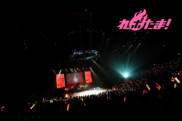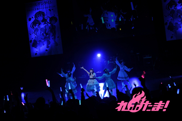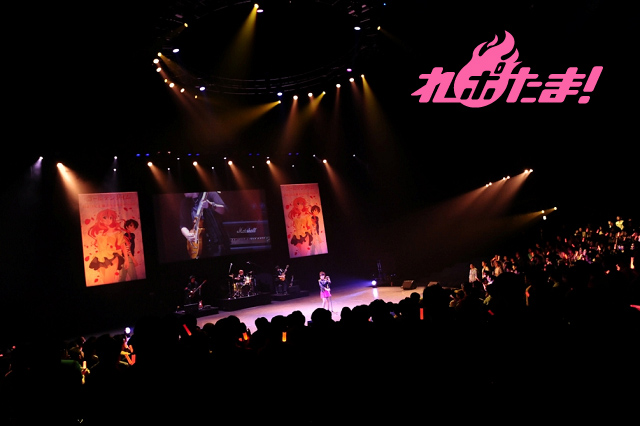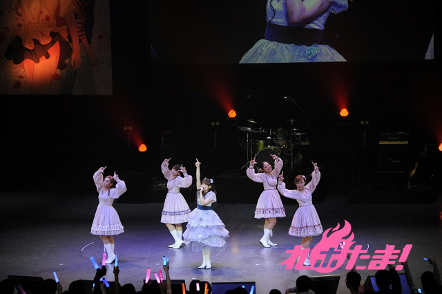 続いてスクリーンにNANA先輩の映像が流されて、ピンクに黒ドットのワンピースに革ジャンを纏ったNANA先輩役・佐藤聡美が登場。ギターにエージ、ベースにトモヤス、ドラムにタクローをバックに従えるなど原作に忠実なステージを展開。「Let’s break together」と、「NIGHTMARE」の2曲をシャウトを交え、熱く歌い上げた。