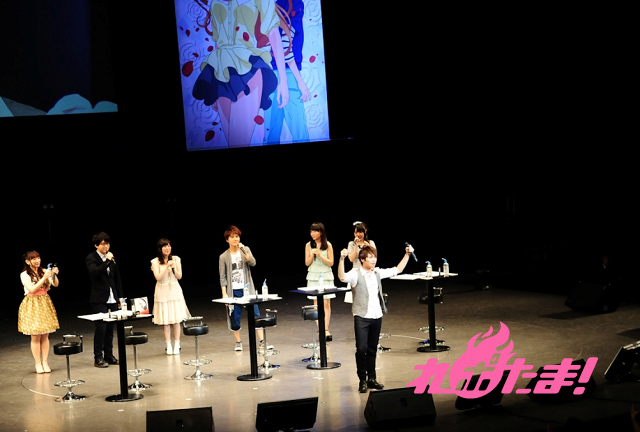 ライブパートが終わり、キャストが登壇。古川慎(多田万里役)、堀江由衣(加賀香子役)、石川界人(柳沢光央役)、茅野愛衣(林田奈々役)、比上孝浩(二次元くん役)木戸衣吹(岡千波役)、佐藤聡美(NANA先輩役)の7人。