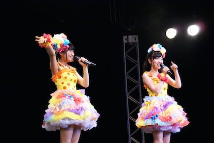 夜の部も1曲目は、もちろん「LUCKY DUCKY!!」からスタート! MUSIC VIDEOでも着ていた黄色とオレンジの鮮やかな衣装で登場した2人による可愛らしい歌とダンスに、会場のファンも熱い声援を送る。2曲目の「PUPPY LOVE!!」と続けてライブ・ポップ・チューンで盛り上がったところで、ちょっと一息ついて最初のMCへ。客席を埋め尽くすピンクと青のサイリウムを改めて見渡した2人は「こんなに人数いると思わなかった!」(夏織)、「後ろのほうも見えてるよ!」(唯)と大喜びだった。