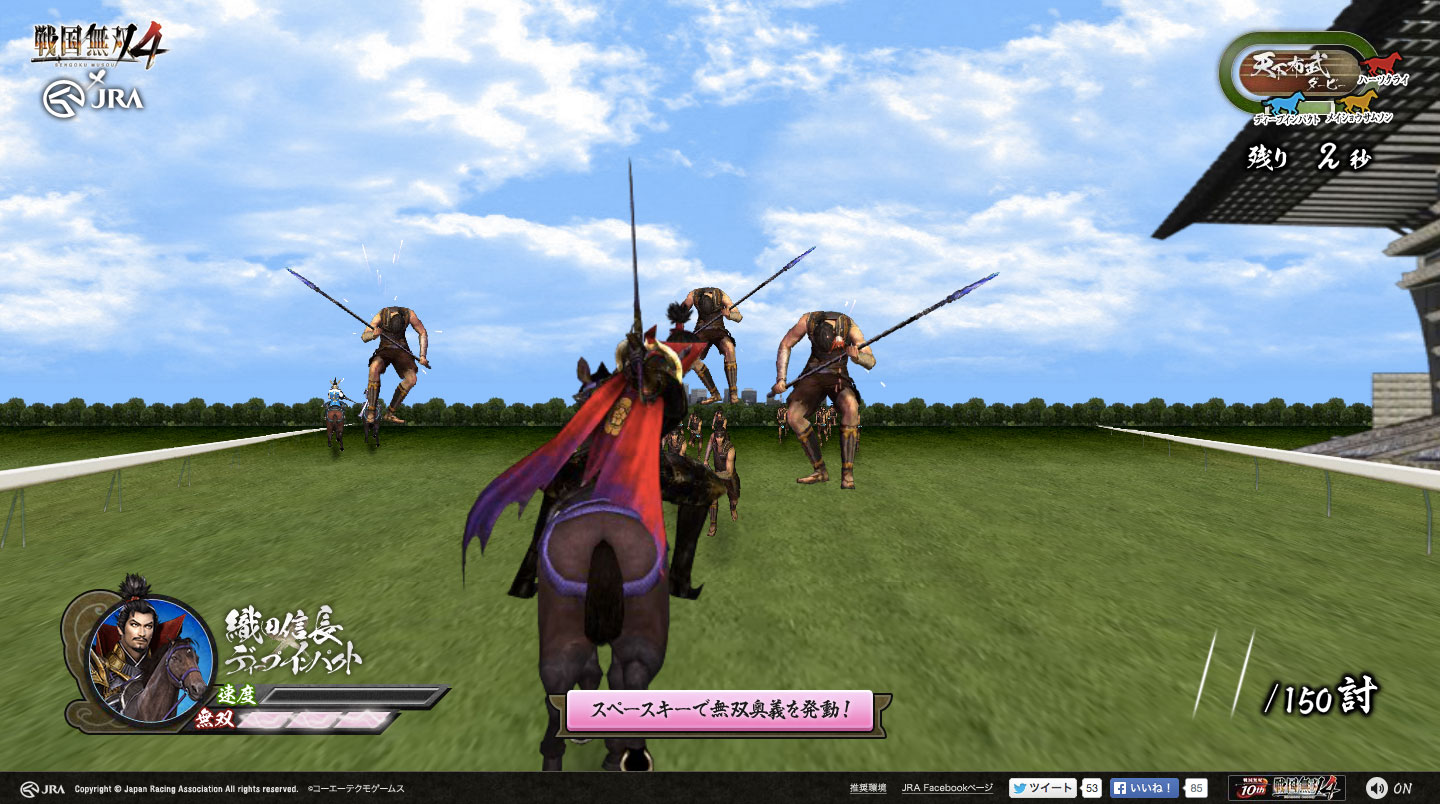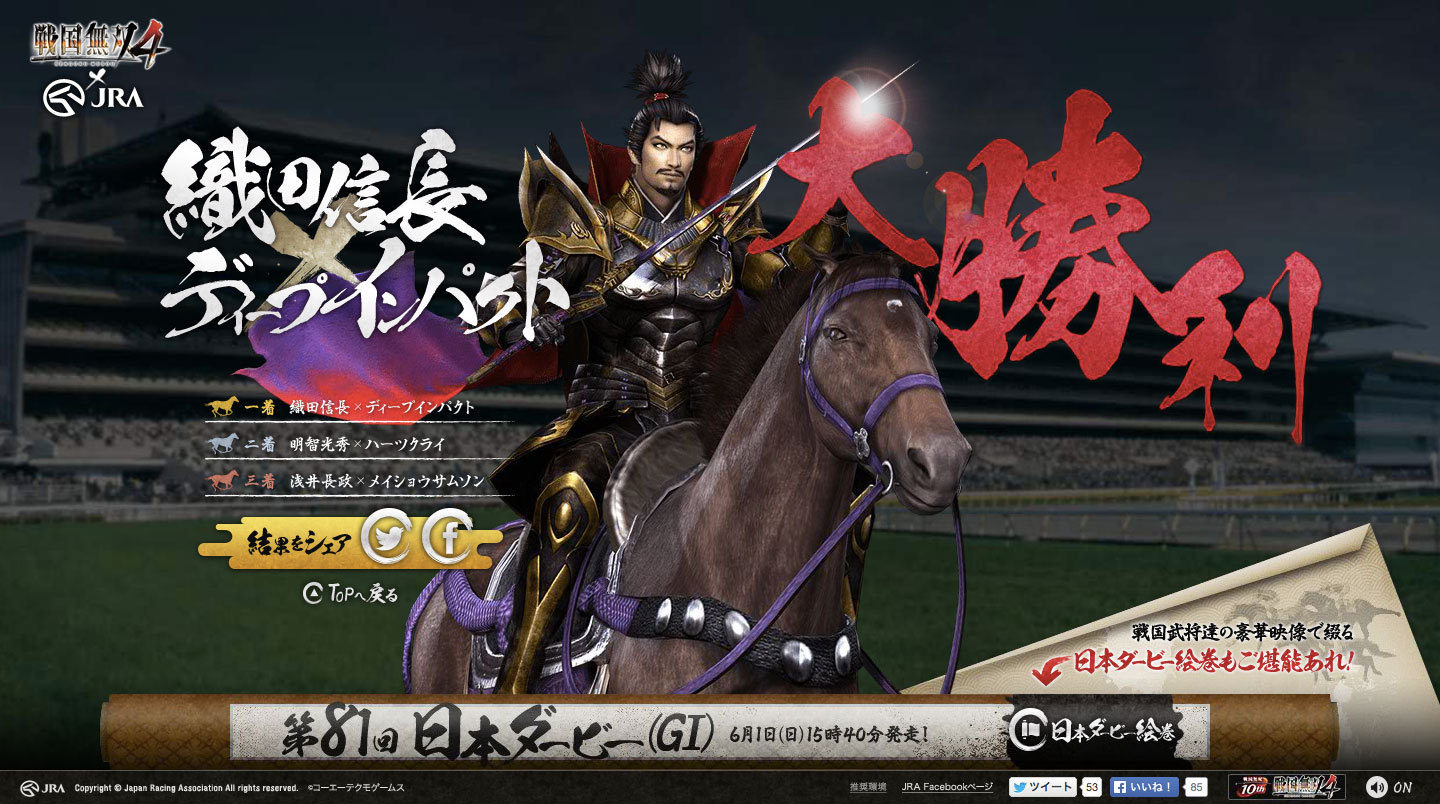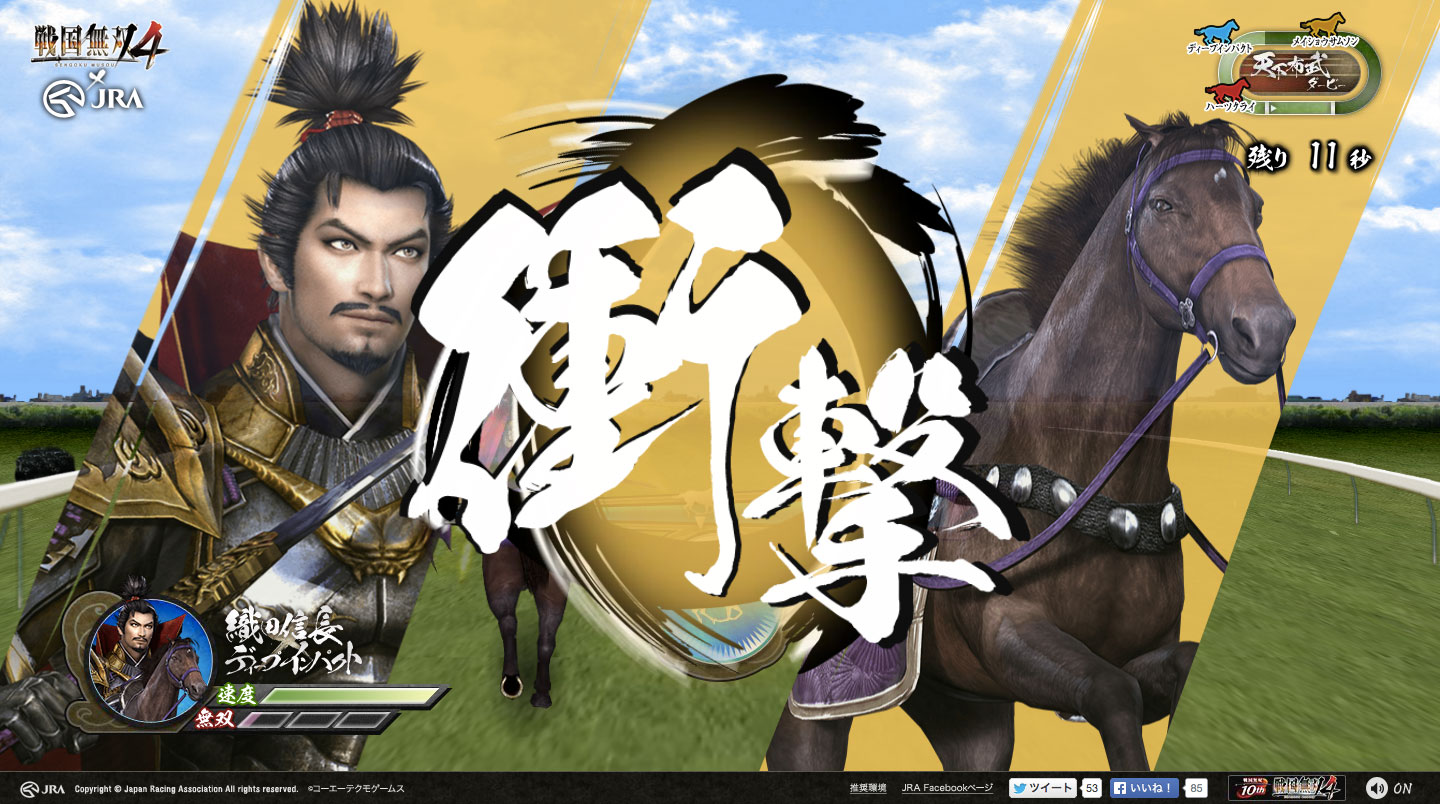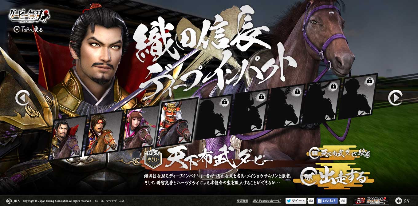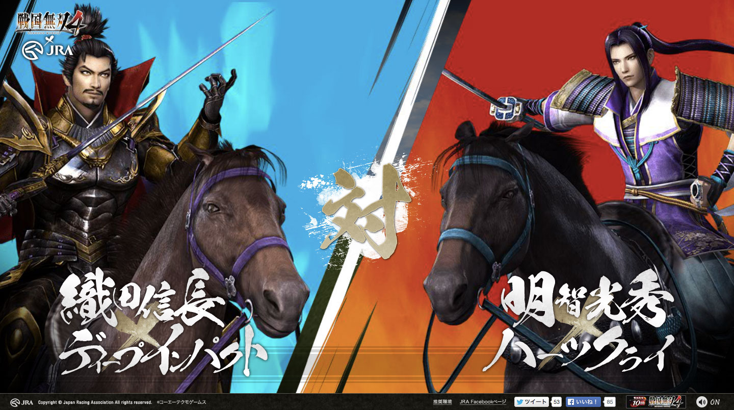 本タイアップは、2014 年6 月1 日(日)に東京競馬場にて開催される「日本ダービー」の開催を記念して行われるもので、『戦国無双4』に登場する武将達がディープインパクトやオルフェーヴルなどの名馬に騎乗し、様々な「ダービー」を繰り広げるWeb ゲームをはじめ、「日本ダービー」にちなんだ会話を無双武将たちが繰り広げるスペシャル映像などを公開するというもの。