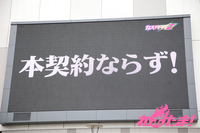 ライブの途中、建物に埋め込まれた大スクリーンに今回のミッションの結果が映し出される。注目の結果は……、本契約ならず! どうやら「フリーライブを行い、『会場をお客さんで埋め尽くして』盛り上げること」という課題の「埋め尽くして」という部分に引っかかってしまったようだ……。